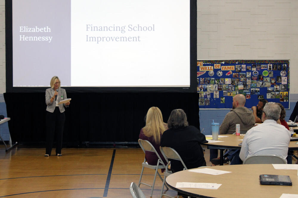 Skokie 73.5 neighbors, staff, and members of the planning team gathered on October 16, 2025, to review "Big Picture Decisions and Funding Pathways" for Building 73.5 maintenance and replacement options. The evening included presentations by Skokie 73.5 Superintendent Dr. Charles Kyle, FGMA Design Principal Mike Denz, and Raymond James Financial, Inc. Managing Director Elizabeth Hennessy.