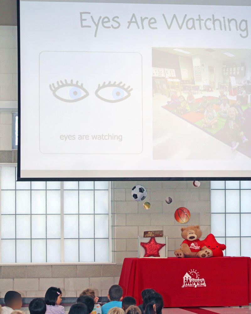 Within each of these areas, we focus on a different expectation for two weeks. Our first focus is being ready with “eyes are watching.” At school, we ask students to have “eyes watching” so that they can be a whole-body listener. For example, students have “eyes watching” when someone is speaking to them or the whole class. Students also have “eyes watching” when they are walking in the hallway, to stay safe. Or, they may need to have “eyes watching” when focusing on a task.